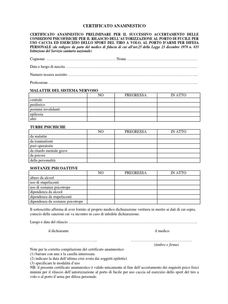 Certificato Anamnestico Porto D Armi Modulo Pdf - Dicendo Immagine