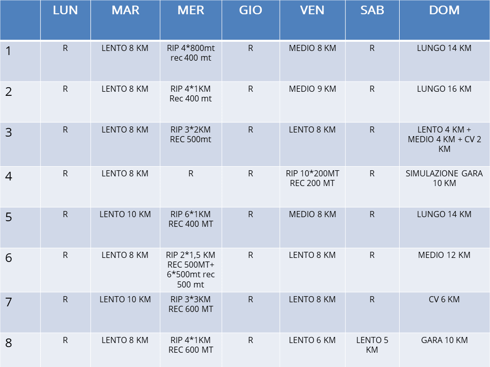 WebLa tabella di allenamento che abbiamo realizzato vuole essere una guida che ti permetterà di arrivare a correre per 30 minuti in modo continuativo. Il programma. WebIn questo articolo ti illustrerò una tabella di allenamento per dimagrire con la corsa indicata per runners intermedi, ma ti spiegherò anche come realizzarne di differenti e altrettanto. Web35 consigli da leggere e ascoltare prima di allacciarsi le scarpe da running. La corsa è uno dei modi migliori per mantenersi in salute, perdere peso e divertirsi. Se stai cercando di. WebAllenamento 1: 20 ripetute in salita media per 30 secondi. Allenamento 2: 20 minuti di corsa, concludere con 5 ripetute da 4 minuti, con salita in pendenza 10/15%. Allenamento 3: 1h. WebDa zero a 5 km in quattro settimane. La corsa ti piacerà sempre di più se ne accetti i tre principi fondamentali: gradualità, costanza e buon senso. Comincia e termina. WebAffronteremo tante sfide, tanti ostacoli, incroci, salite e lo faremo al meglio delle nostre possibilità. La corsa ci fa correre più forte la nostra vita. Inizia da subito il tuo programma. WebEstrarre una tabella da un pdf. La maggior parte dei piani di allenamento per la maratona dura dalle 16 alle 20 settimane. Durante questo periodo, di solito si corre.